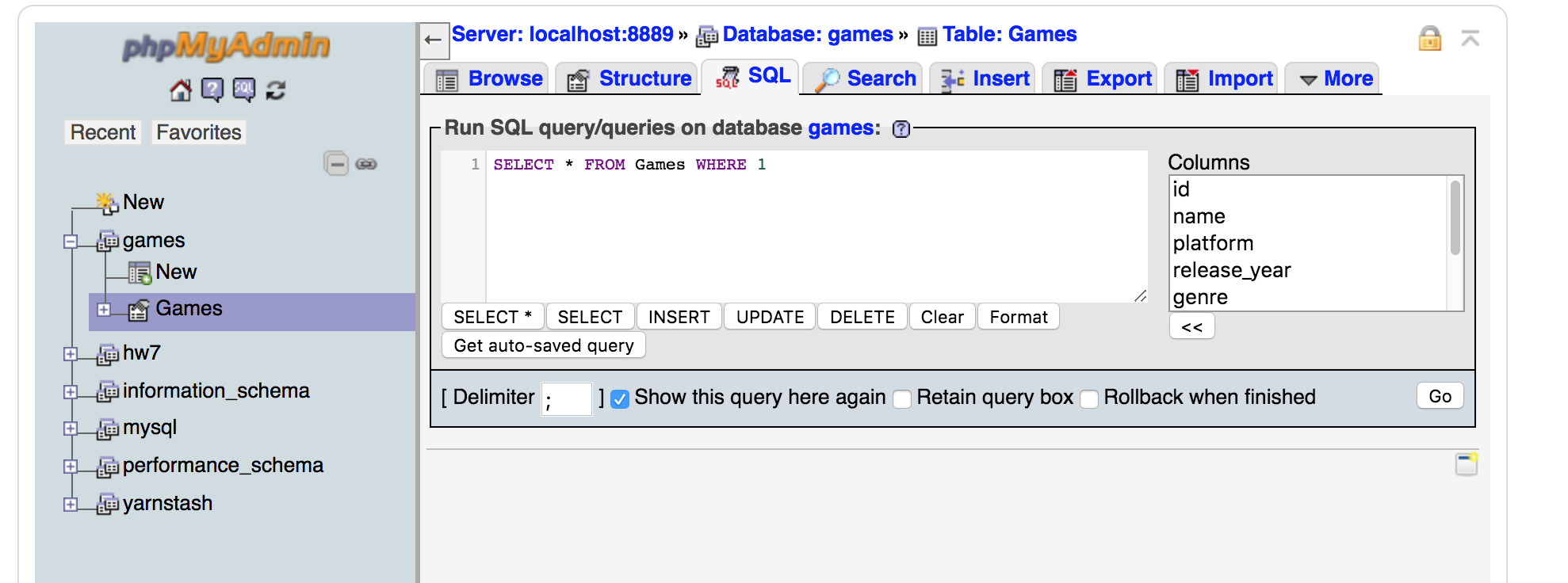 Step 13: Click on the SQL tab to get a big dialog box where you can enter SQL queries directly.