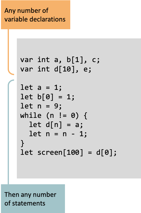 Notably, every variable declaration statement must start with "var int" and end with a semicolon. It can have 1 or more variable names to declare, separated by commas. As seen in the above example, arrays can be created by placing brackets after a variable name and giving a literal number describing the length of that array (used to instantiate the array in memory, but never checked during an array access). Arrays and ints can be intermixed in a single variable declaration statement. The "Variable Declarations" section can contain many variable declaration statements like the one above, so it is up to the programmer to decide how to break up their declarations for readability.
