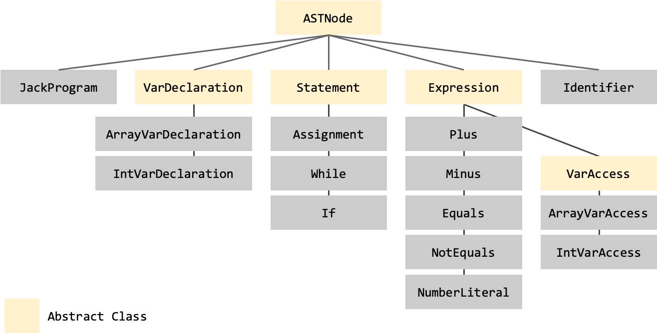 inheritance hierarchy among those AST nodes, where JackProgram is the root node,