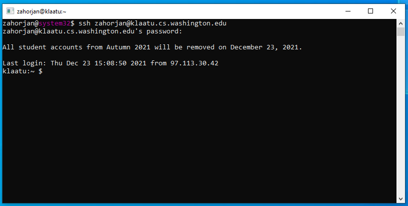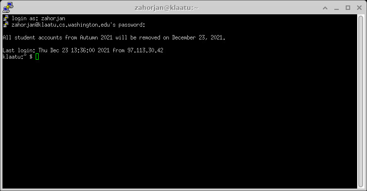 There are many possible ways to get your work done in this course. That said, the course work is designed on the assumption that you will be working by remote login to klaatu.cs.washington.edu. Registered students will have an account created there (by the first day of classes) with username the same as your uw netid and with a random password that will be provided to you by email.