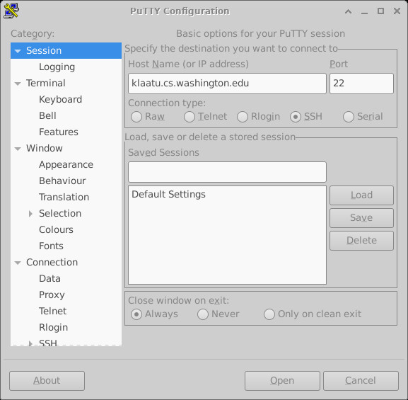 PuTTY is lightweight SSH client endorsed by UW IT. The download site is here. When you launch it, you will see something like this: