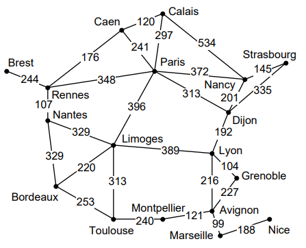 Page 184 in the reading shows the state space for this problem, with the distances on the graph edges. When you run the code you should get a solution path of 4 edges (5 cities) and total distance 1041: [’Rennes’, ’Nantes’, ’Limoges’, ’Lyon’, ’Avignon’]. It might be formatted differently in the printout. The map is also shown below:
