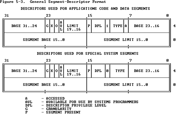 Segment-Present bit: If this bit is zero, the descriptor is not valid for use in address transformation; the processor will signal an exception when a selector for the descriptor is loaded into a segment register. Figure 5-4 shows the format of a descriptor when the present-bit is zero. The operating system is free to use the locations marked AVAILABLE. Operating systems that implement segment-based virtual memory clear the present bit in either of these cases: