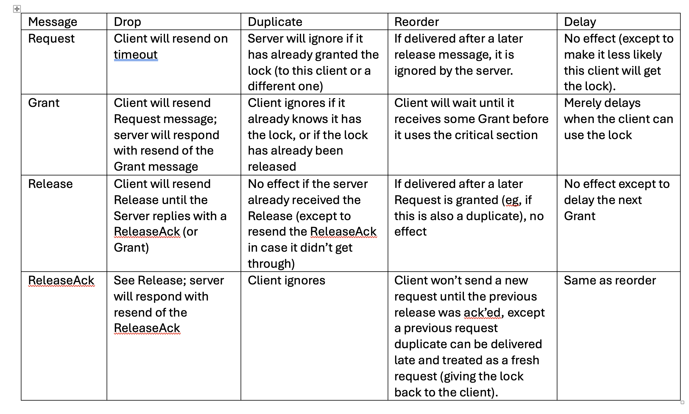 - The table summarizes how message drops, duplicates, reorders, and delays are handled. Unless the lock is currently held by the client, the client will always retry, and so either the lock will be released (if the release was lost) or the lock will be acquired (if the lock is currently free).