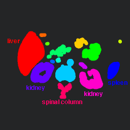 The main goal of this assignment is to find organs of interest in CT images, using techniques of binary vision. The organs of interest are the kidneys, the liver, and the spleen, as shown below.