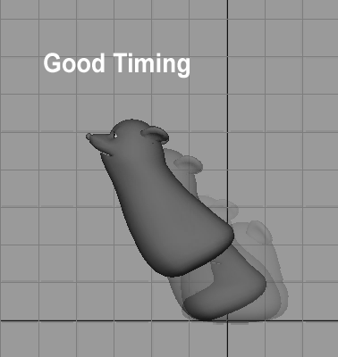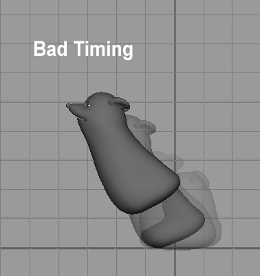 When all of your poses are finally in Maya, you can begin timing them out. Timing is also one of the animation principles, and it can be a very difficult one to pin down. It is almost impossible to get it right on the first try. Don't be afraid to repeatedly tweak your motion and playblast to check. One or two frames can make the difference between too fast and jumpy or too slow and floaty. Remember to select all of a character's controls when shifting poses around in Maya, otherwise you might end up with offset keyframes and a messy timeline.