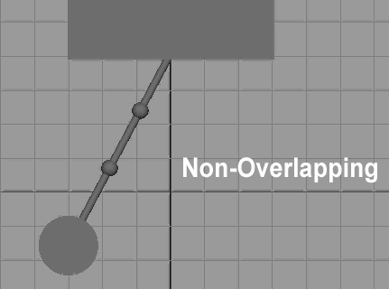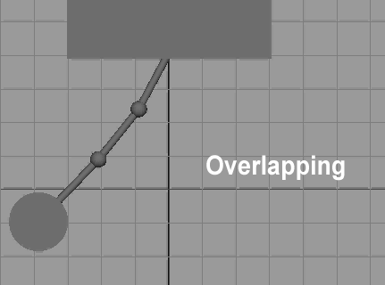 Overlapping action is the idea that several actions don't just take place all at once or one at a time; they overlap. This applies not only to broader movements, but to how parts of a character move in relation to the rest of their body. Take a look at the pendulum clips below. In the one without overlapping action the three pendulum segments move together. In the one with overlapping action, the lower segments lag behind the upper ones. When the top link slows down and starts swinging to the left, the middle link continues swinging the right because of its continued momentum. Drag will then cause it to stay to the right until the pendulum swings back again.