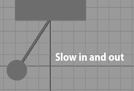 One common problem in beginning animation is character motion that tends to start, stop, or change directions abruptly, resulting in robotic movement. An easy way to fix this is to use the slow in and out animation principle (also referred to as "ease in and out"). A natural example of this principle can be seen in the pendulum below. As gravity overtakes the pendulum it begins to slow down to a brief stop, until it begins accelerating again in the opposite direction.
